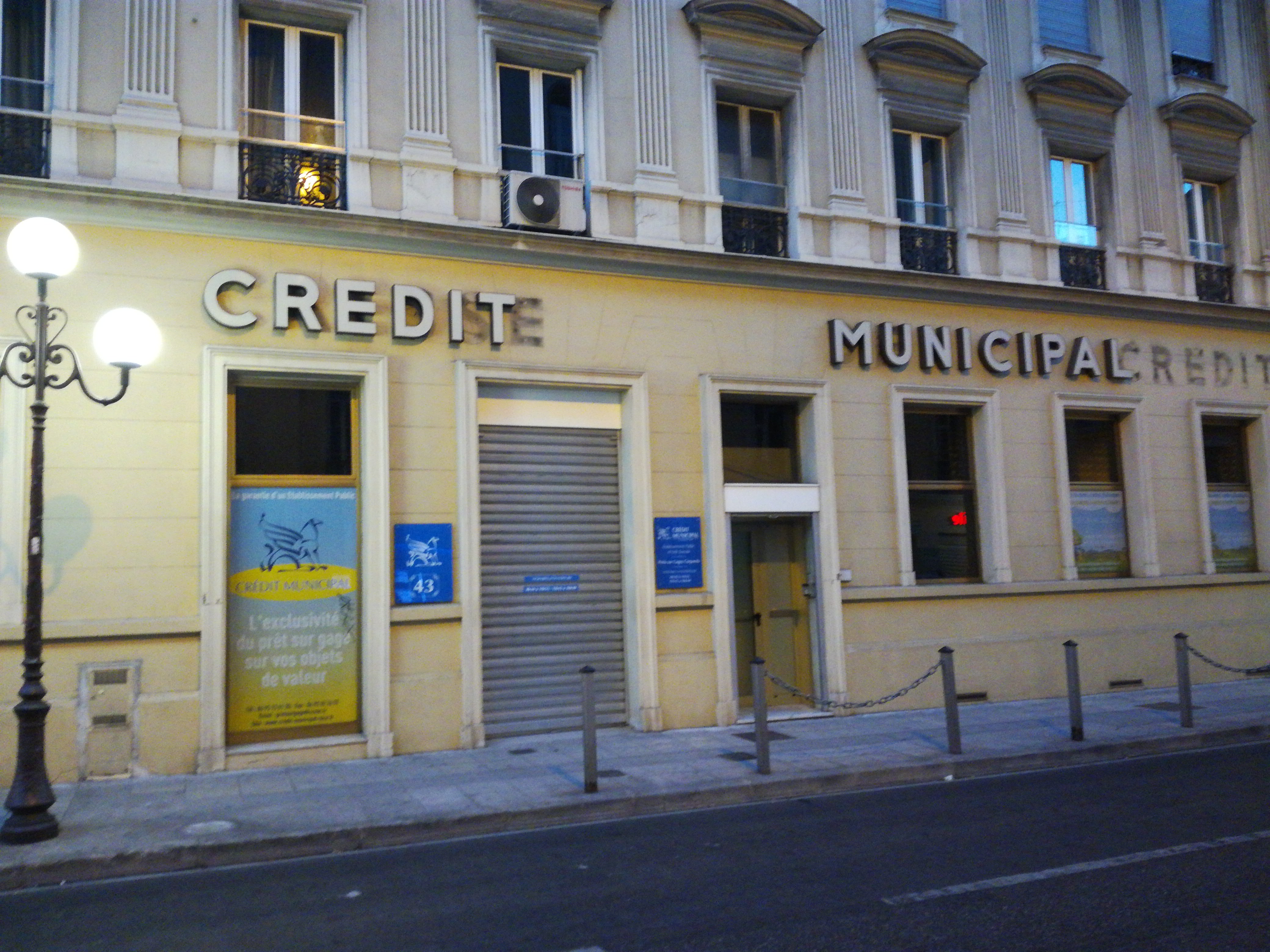 Les bijoux ou autres objets de valeur peuvent être nantis ou déposés dans le cadre d'une vente future (dans les 3 mois). Dans les deux cas, le client reçoit une somme d'argent. Si nantissement, la somme et les intérêts sont à rembourser au bout de 6 mois et les objets rendus (une prolongation de 6 mois peut être accordée par le commissaire priseur). Si vente, le prêt est retranché de la somme finale et le client peut percevoir la différence moins les intérêts. Aucune estimation sur photo. Les objets sont à présenter les mardis et vendredis de 9h00 à 10h45 (à vérifier). DANS TOUS LES CAS, se munir d'une pièce d'identité, de son dernier avis d'imposition et d'un justificatif de domicile de moins de 3 mois. ATTENTION : pas de stationnement pour les clients du C.M. Le parking le plus prêt étant celui de la place Massena.
